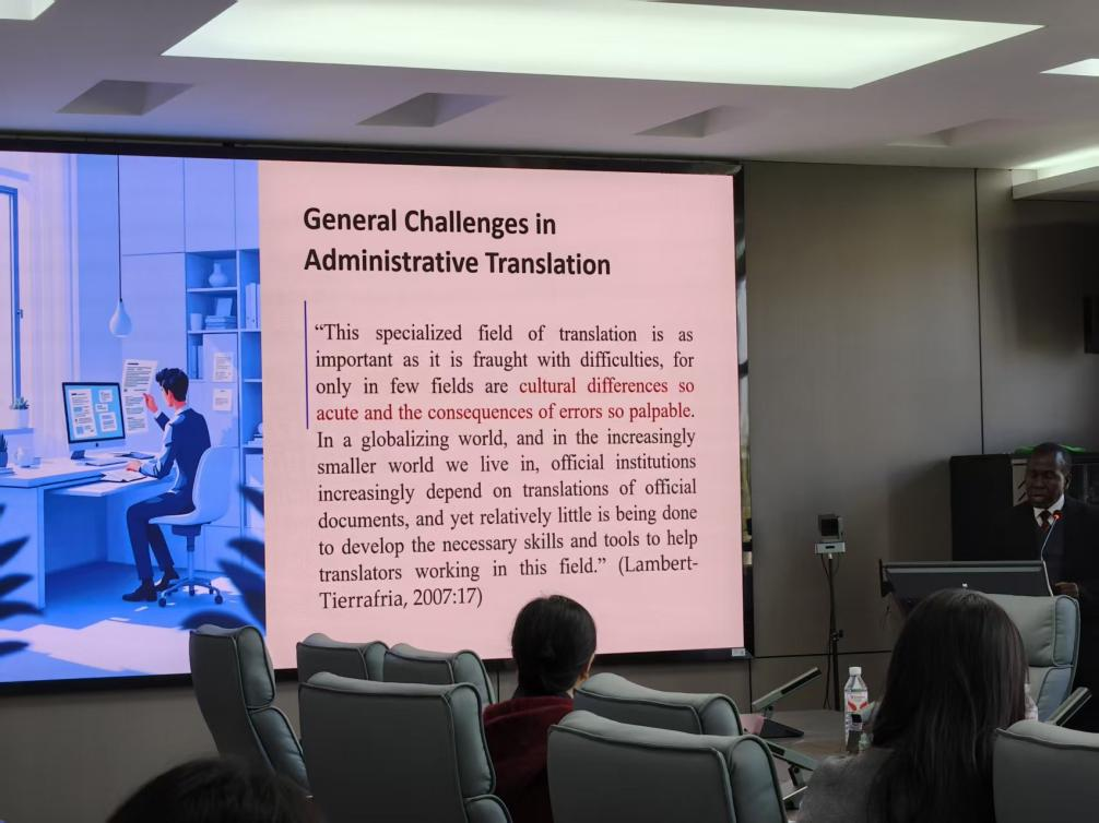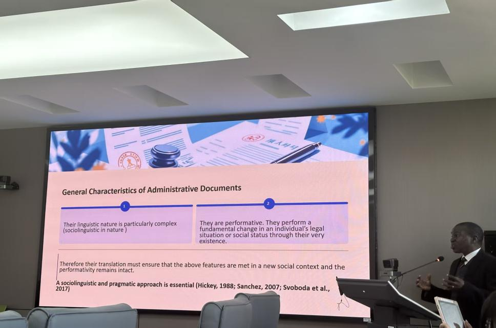 Dr Sebuyungo首先结合自身在乌干达从事法语—英语行政文件翻译的丰富经验,系统介绍了行政文件的定义、主要类型以及翻译过程中常见的语言与文化挑战。他指出,行政文件不仅是语言载体,更是社会与法律身份的凭证,具有“Performative”,翻译者在处理此类文本时应充分考虑社会语境与文化制度的差异。