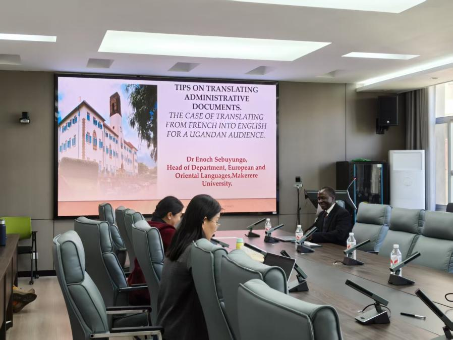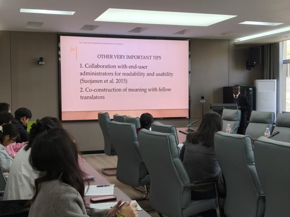 自湘潭大学中非研究院筹备、建立以来,我院积极推进与非洲高校的文化交流与合作,于本月24日下午特邀乌干达麦克雷雷大学欧洲与东方语言系主任,以诺·大卫·塞布永戈博士(Dr Enoch David Sebuyungo)来我院讲学,为我院师生带来一场题为“运用社会学和语言学方法论将法语行政文本翻译为英语”的学术讲座,讲座由我院唐慧丽副教授主持,我院教师与研究生参与。