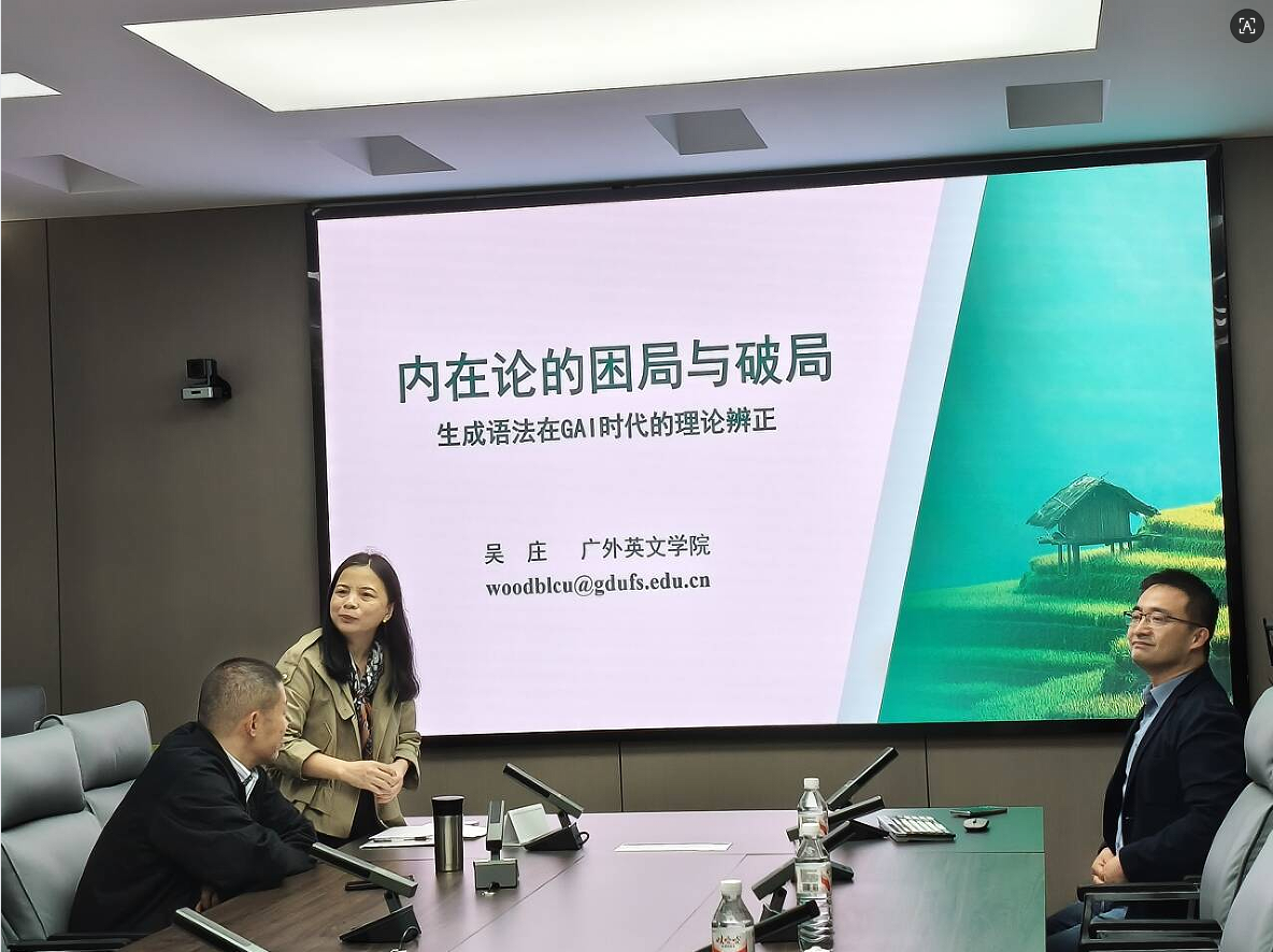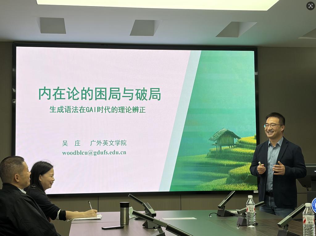 (通讯员 罗健京)2025年10月31日晚19点,我院外国语言文学与跨国研究中心系列学术报告会在外语楼304会议室成功举办。bwin中文官网优秀校友、广东外语外贸大学英文学院副院长吴庄教授应邀带来题为“内在论的困局与破局:生成语法在GAI时代的理论辨正”的学术讲座。文卫平教授、杨华教授等学院教师及研究生参加了本次学术活动,讲座由我院傅顺华教授主持。