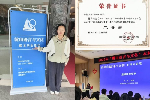 外国语学院(通讯员 梁建伟 张羽彤)2025年10月25日,外国语言文学"世界一流"建设学科品牌活动——"麓山语言与文化"本科生论坛在湖南师范大学外国语学院圆满落幕。作为聚焦跨文明对话与青年学术养成的高端交流平台,本次论坛不仅汇聚全国高校本科生共探语言与文化的交融之道,更见证了我院学子的学术突破。论坛现场,我院2023级英语专业刘新悦同学凭借《中越"鱼化龙"神话传说中的跨国叙事》一文获评论坛二等奖,并受邀作主题宣讲,向学界展现湘大外院青年学子深耕文化研究的青春力量。