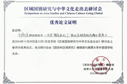 此次获奖是刘新悦深耕历史文化研究领域,持续积淀的必然结果,更始于一次“有温度的引导”。她的研究始于大二《中国哲学与文化》课堂——吴群涛老师以"外研社·国才杯"大学生外语能力大赛演讲主题"The Chinese Dragon Is Good"演讲题为引,将语言学习与文化传播深度勾连:“龙文化是中华文明的精神符号,如何用外语讲好它的故事,是当代青年的学术责任。”这番话如种子般埋入刘新悦心中——她自此开启中国龙意象跨文化传播的研究旅程,主动跨选政治学、传播学等课程,研读《中国神话史》等典籍,构建起跨学科研究框架。2024年11月,其论文《中国"鲤鱼跃龙门"典故在越南的传播及演变》获"区域国别研究与中华文化走出去"学术研讨会"优秀论文";2025年4月,她受邀在波兰居里夫人大学线上论坛用英文宣读研究成果;同年5月,经国内外学术交流打磨的《"鲤鱼跃龙门"与"鱼跃武门"——中越民间故事文化渊源》,获第二届"夏鼎杯"湖南省高校本科生历史写作大赛优秀奖,实现从“语言技能训练”到“历史文化研究与跨文化传播”的转型。