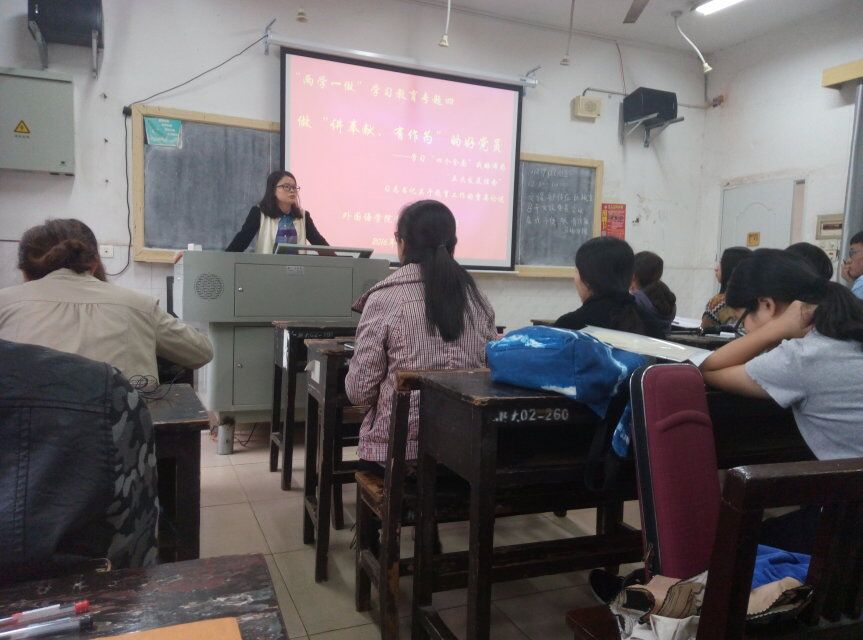 2016年10月18日,外国语学院学生第一党支部在外语楼218开展了“两学一做”之“讲奉献、有作为”的专题学习。支部书记蒋孟昕老师出席了本次支部学习,并向党支部的成员强调了提高政治觉悟,坚守思想阵地的重要性,她同时鼓励党支部同志从自我做起,从小事做起,多付出,争做“讲奉献,有作为”的优秀学生党员。