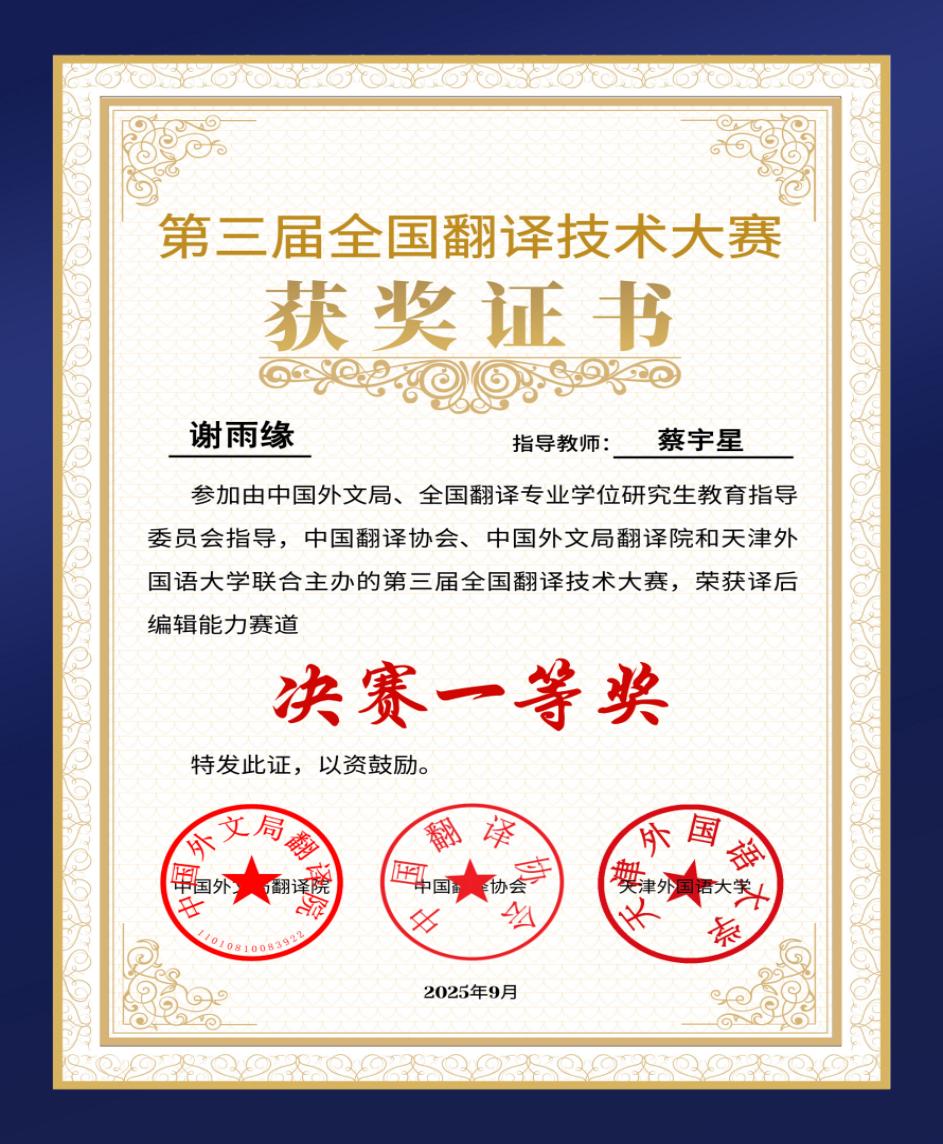 (通讯员:侯晟)2025年9月20日,第三届全国翻译技术大赛在天津圆满落幕。经过激烈角逐,我院2022级英语系学生、口译队队长谢雨缘(指导老师:蔡宇星)从全国近3000名参赛选手中脱颖而出,荣获译后编辑能力赛道决赛最高奖项一等奖。